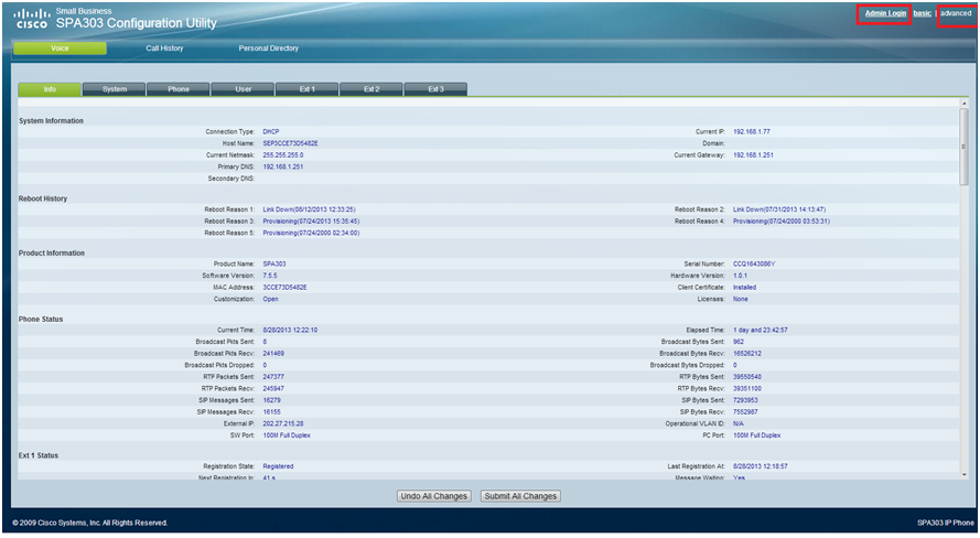 - You only need this number in the address panel to connect to the phone. Now you should see the User interface for your SPA303, now select “Admin Login” and then “Advanced” Now you can change your settings.